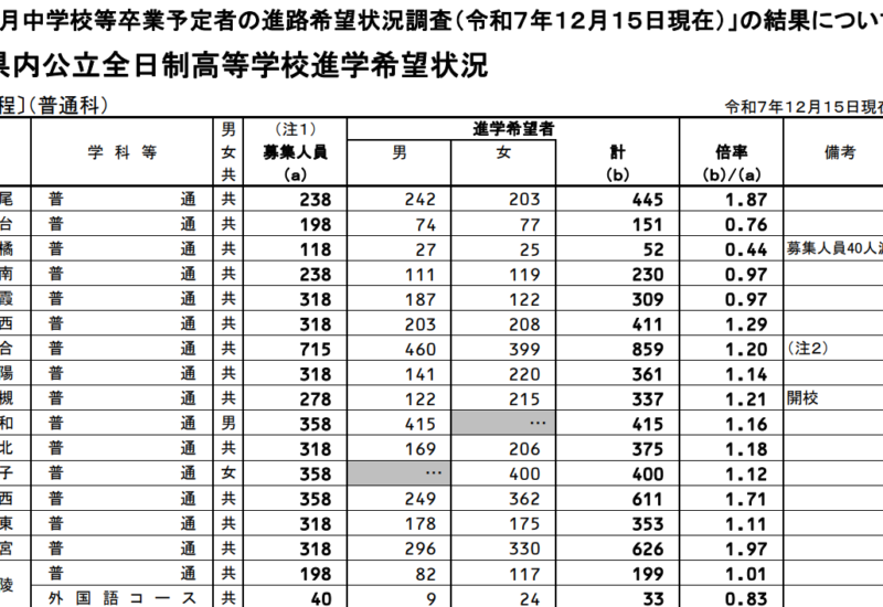〈2026年度入試〉東京都「都立高 志望予定調査」結果(1月7日)