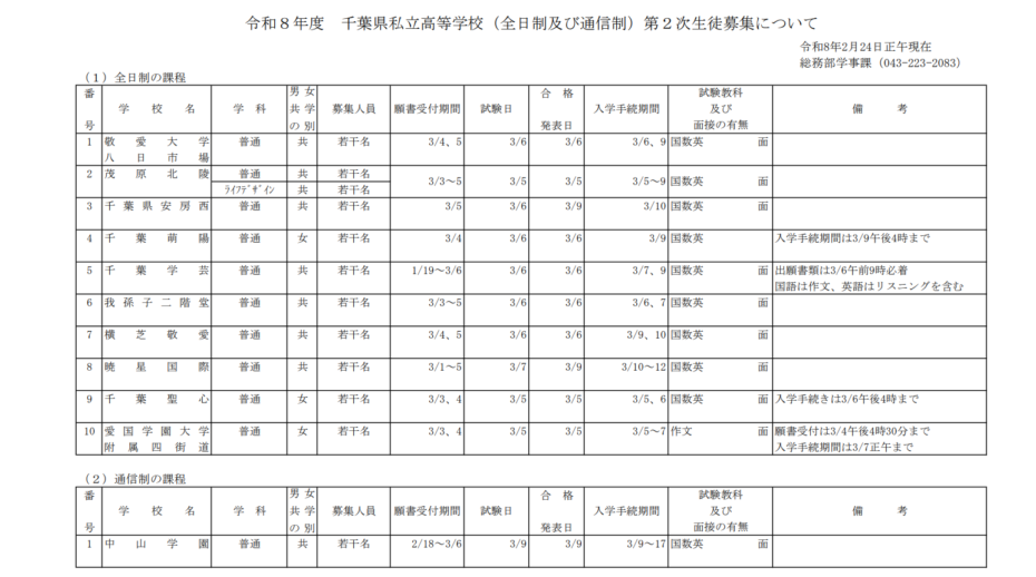 〈2026年度入試〉千葉県 「私立高校【第二次生徒募集】」募集状況-令和8年度