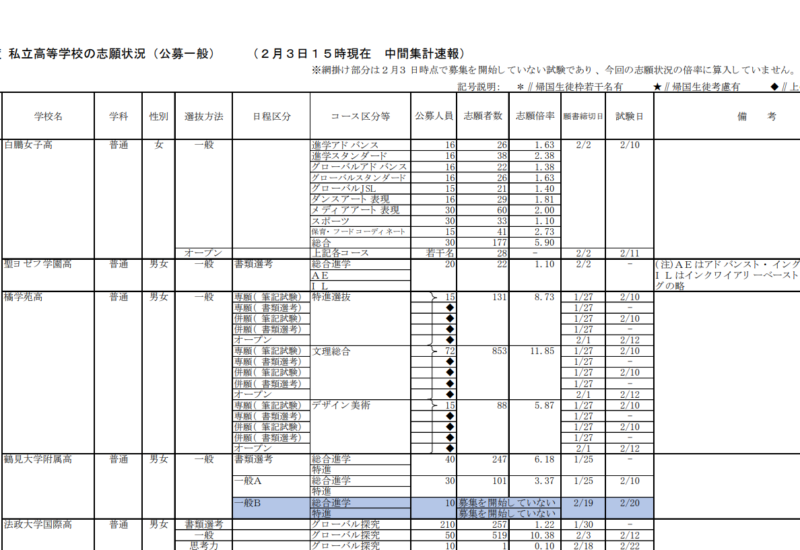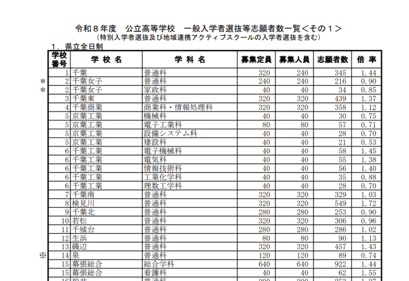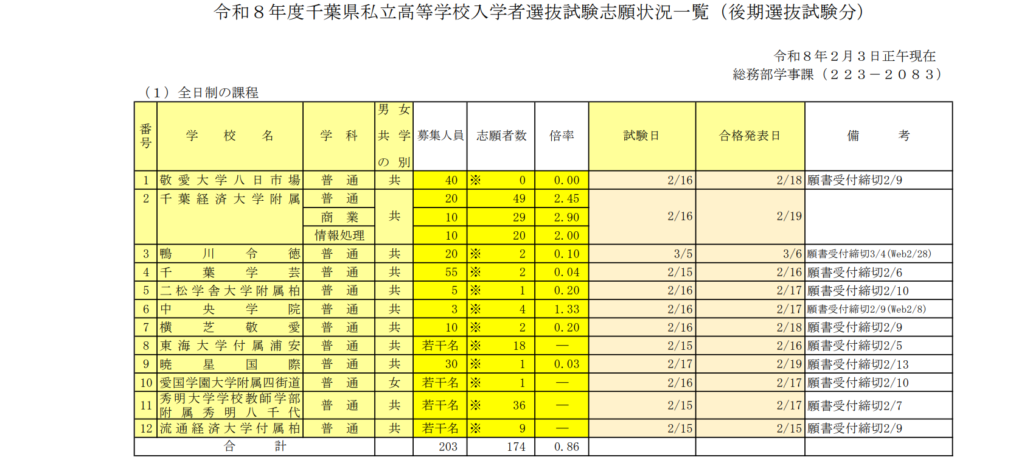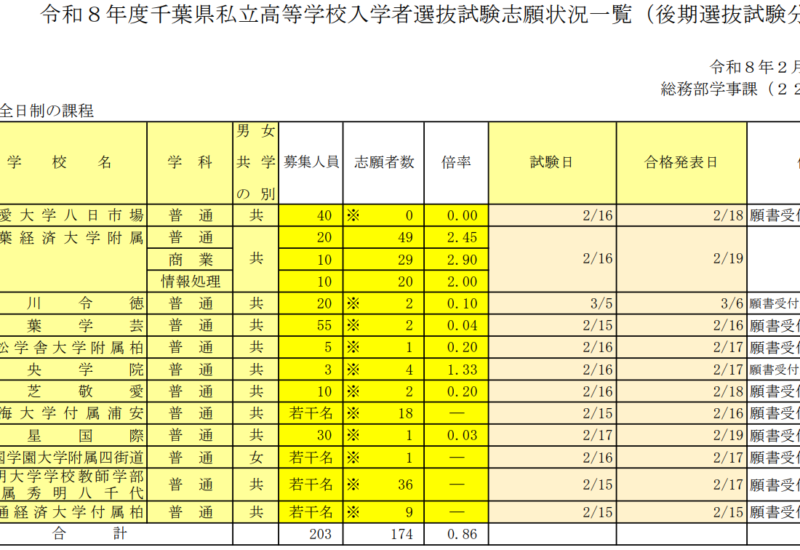 〈2026年度入試〉千葉県私立高校「志願状況等について(前期選抜試験分)」-令和8年度
