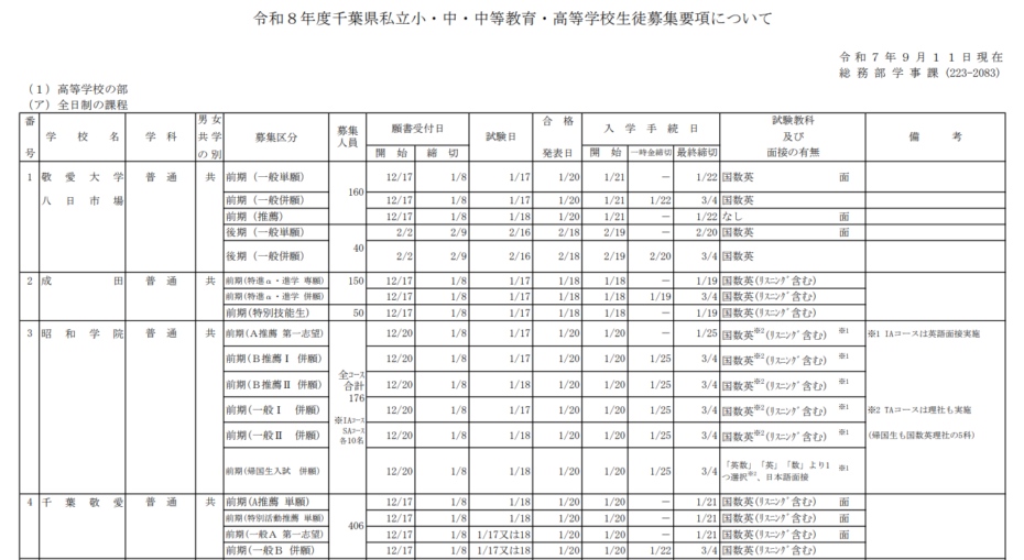 〈2026年度入試〉千葉県 私立高校「募集人数・募集要項」発表-令和8年度