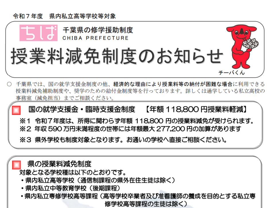 千葉県 私立高校「令和7年度 私立学校学費支援制度」(2025年度)