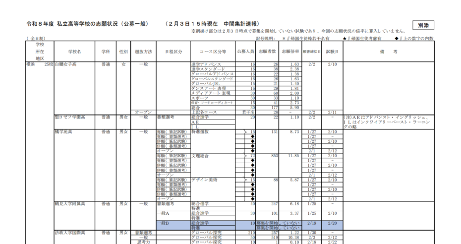 〈2026年度入試〉神奈川県 私立高校「志願状況(2月3日付け)」 全日制4.79倍