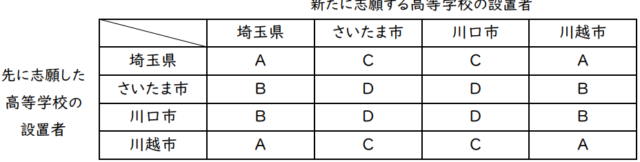 ・志願先変更は、先に志願している高等学校、志願先変更したい高等学校の設置者(埼玉県・さいたま市・川口市・川越市)によって、手続が異なります。表から自分がするべき手続を確認してください。A~D別で説明ページがあります。