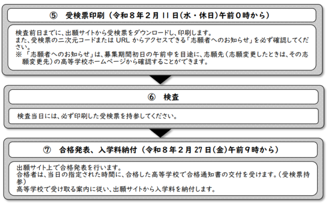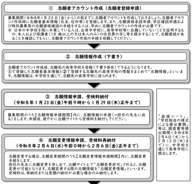 「志願のてびき」にも出願サイトによる志願手続の流れがまとめられています(P2)。日程も 記載されていますので、こちらも確認しておきましょう。