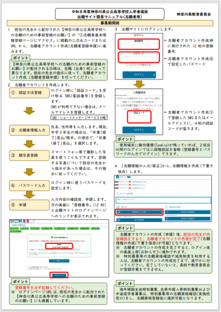 マニュアルは募集期間前・募集期間 ・受検票印刷期間・合格発表当日と、時系列でまとめられており、各項目でポイントも記載されています。確認しておきましょう。