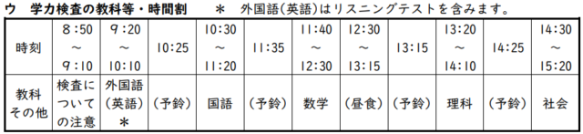 ・学力検査は令和8年2月17日(火) 、科目は午前中に外国語、国語、数学、昼食を挟んで午後に理科と社会が実施されます。※ 外国語(英語)はリスニングテストを含みます。