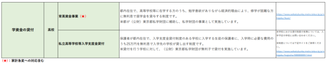 保護者が都内・在住で、入学支度金貸付制度のある学校に入学する生徒の保護者に、入学時に必要な費用のうち25万円を無利息で入学先の学校が貸し出す制度です。