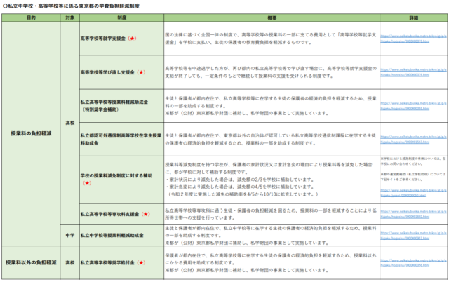 私立中学校・高等学校等に係る東京都の学費負担軽減制度(一覧)PDF