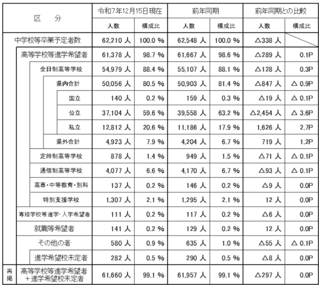 今回は、2025年10月1日現在で実施した「令和4年3月中学校等卒業予定者の進路希望状況調査」に続き、2025年12月15日現在で実施した同調査の結果を発表したものです。