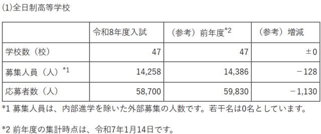 令和8年度入試における全日制高等学校の応募状況(中間)の概要は以下のとおりです。