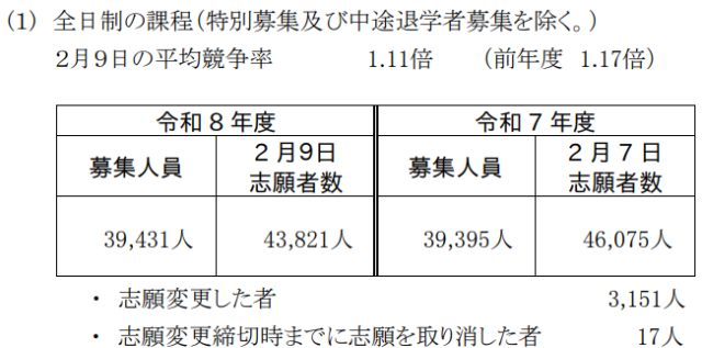 全日制校の募集人員39,431人(前年39,395人)に対して志願者数は43,821人(前年46,075人)。