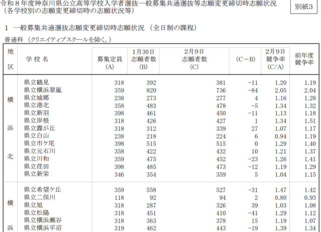 別紙2「令和8年度神奈川県公立高等学校入学者選抜一般募集共通選抜志願締切時志願状況」(各学校別の志願変更締切時の志願状況等)(PDF)