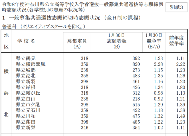 別紙3「令和8年度年度神奈川県公立高等学校入学者選抜一般募集共通選抜等志願締切時志願状況」(各学校別の志願の状況等)