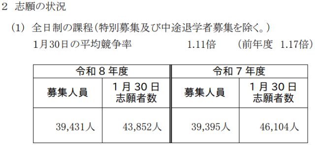 全日制 139校(前年度142校)の募集人員39,431人(前年度39,395人)に対して志願者数は43,852人(前年度46,104人)。