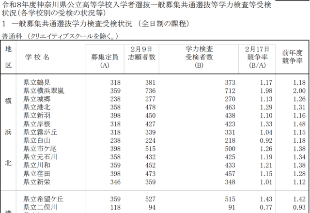 別紙2「令和8年度神奈川県公立高等学校入学者選抜一般募集共通選抜志願締切時志願状況」(PDF)
