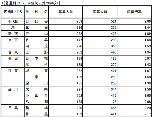 普通科で高倍率となったのは駒場2.20倍、目黒2.17倍、豊島2.16倍、青山2.12倍、日比谷2.06倍、など。