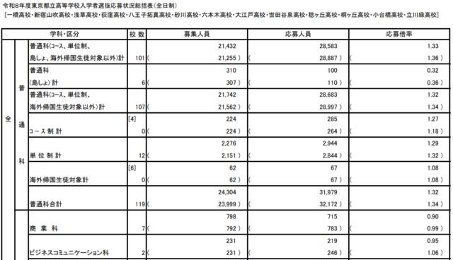 「令和8年度東京都立高等学校入学者選抜応募状況(学力検査入学願書受付)」を発表。