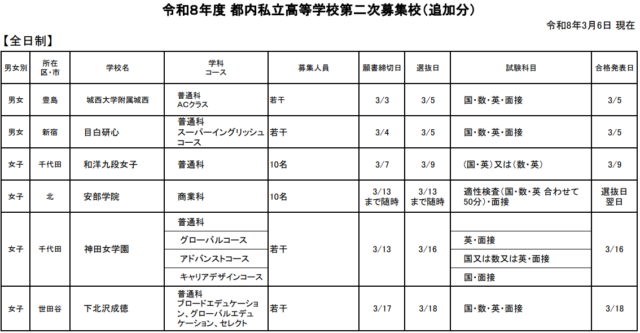 ※同日(25日)東京都も発表した「令和8年度都内私立高等学校第二次募集校一覧(第2回)」と併せ確認してください。