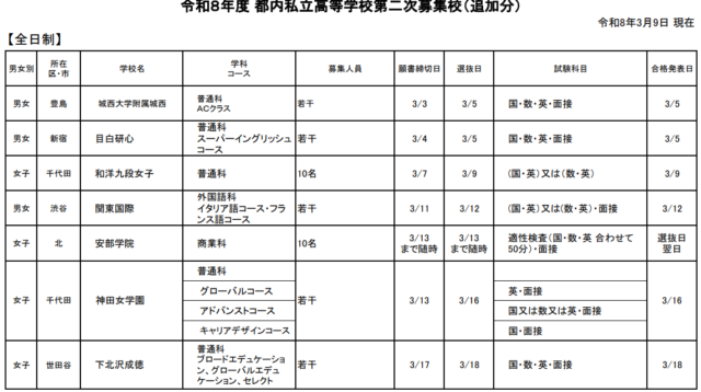 令和8年度都内私立高等学校 第二次募集(第2回)について〈3月3日更新〉