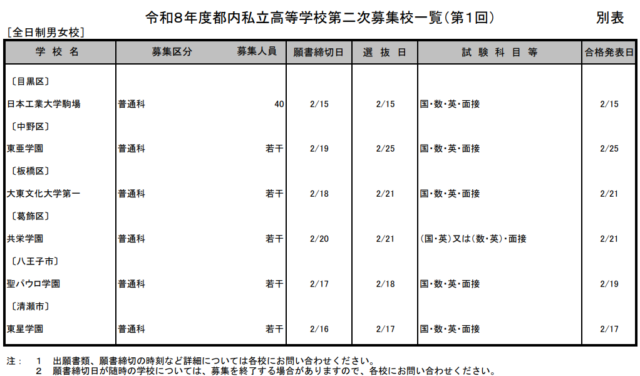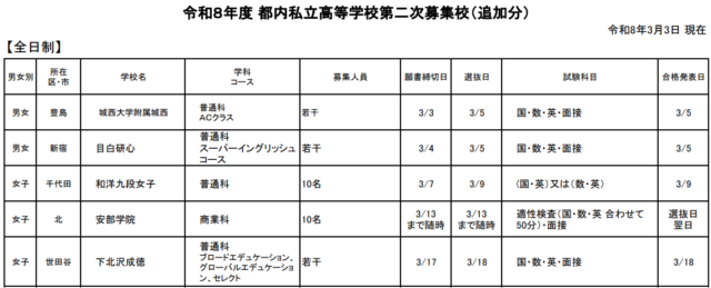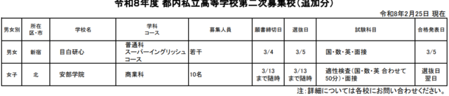 ※同日(25日)東京都も発表した「令和8年度都内私立高等学校第二次募集校一覧(第2回)」と併せ確認してください。