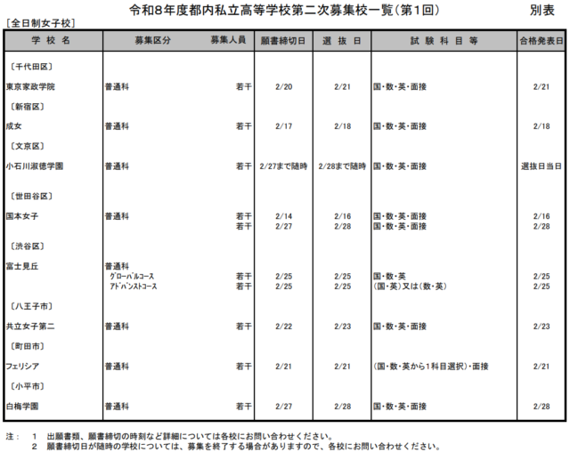 (前年度はこの発表と同時に、東京私立中学高等学校協会から「一覧以外の募集(数校)」も発表されました)