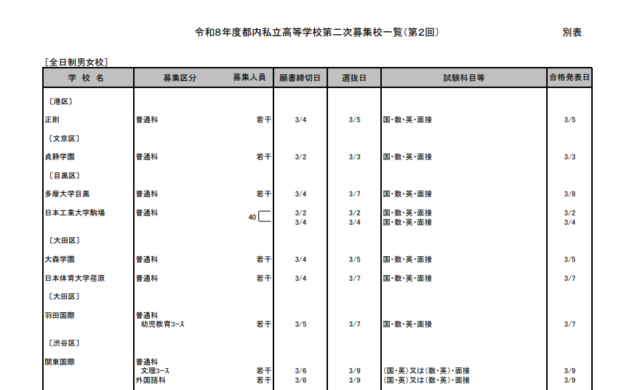 ※25日発表の「令和8年度都内私立高等学校第二次募集校一覧(第2回)」と併せ確認してください。