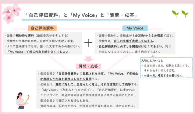 ・『「My Voice」は、自己評価資料と必ずしも関連付ける必要はありません。自分を振り返り、経験を言葉にして、それを他者に伝える姿勢が大切です。一言一句、暗記する必要もありません。』とあります。