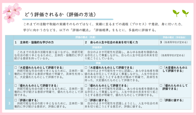 『これまでの活動や取組の実績そのものではなく、実績に至るまでの過程(プロセス)や意欲、身に付いた力、学びに向かう力などを、以下の「評価の観点」「評価規準」をもとに、多面的に評価する。』あり、