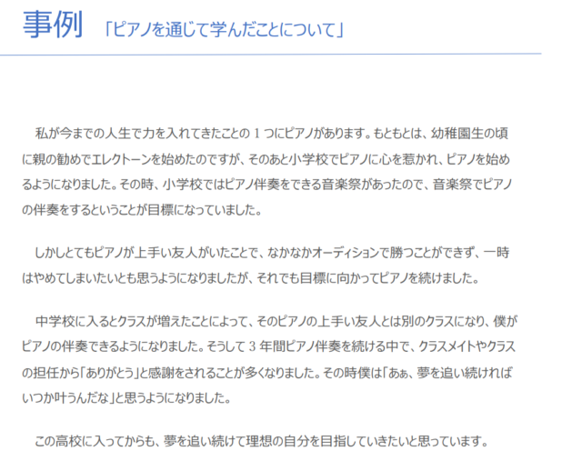 事例は「ピアノを通じて学んだことについて」「好きなことを追求し、責任感と向上心を育んだこと」など7つあり、音声データと文書データで確認できます。