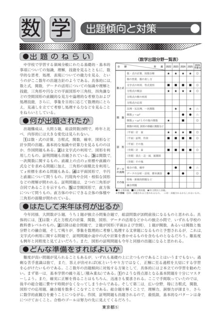J また、教科別の「出題傾向と対策」というページがある。そこにはカコモンに掲載されている過去数年分の問題の出題分野がまとめてあるよ。自分の得意分野や苦手分野を把握できる。