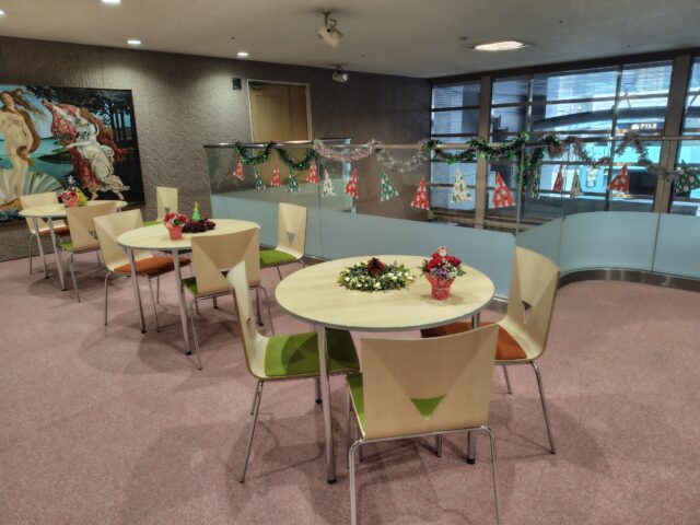 ロビーのクリスマスツリーは事務室の先生が、賑やかなオーナメントの数々はネイティブの先生が飾りつけてくださったそうです。
