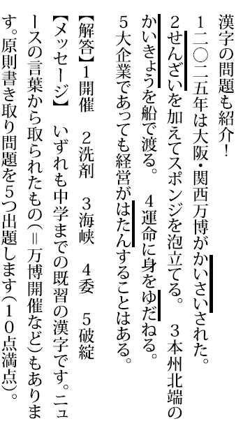 「漢字の問題」付き、漢字の書き取りは5問出題されています。